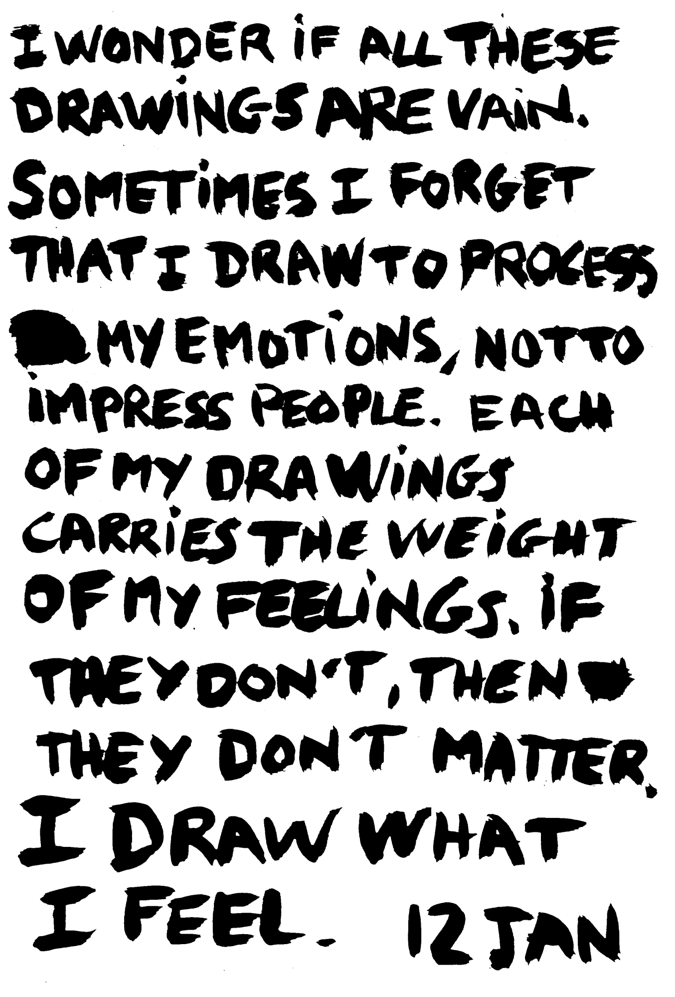 My Emotional Life is the third volume of my drawn diaries and a sequel to Raw Feelings. I explored my inner life and day-to-day emotions over several months, between January and September 2023. Most of the drawings and texts were drawn and written in my sketchbooks.